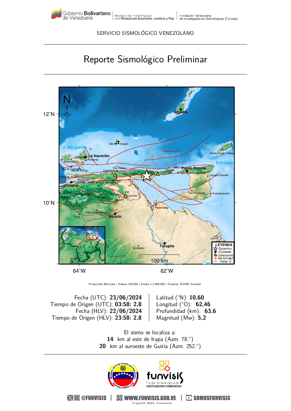 Este sábado en la madrugada, ya casi para domingo, un sismo ocurrido a 14 kilómetros al Este de Irapa, estado Sucre, Venezuela fue sentido en casi todo el territorio nacional, en Islas Vírgenes y en Trinidad y Tobago.