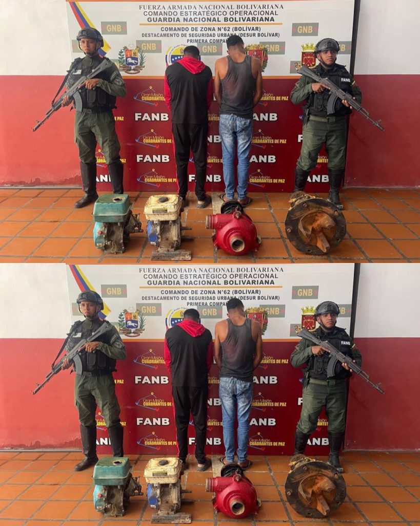 En el marco de la Operación Roraima 2024, y en labores de patrullaje terrestre y escudriñamiento, encontraron a estos ciudadanos a quienes les incautaron diez tames de madera, mil cien metros de manguera plástica de 4 pulgadas; dos moto bombas; dos turbinas; dos tambores contentivos de 100 litros de combustible y 30 metros de manguera de alta presión.