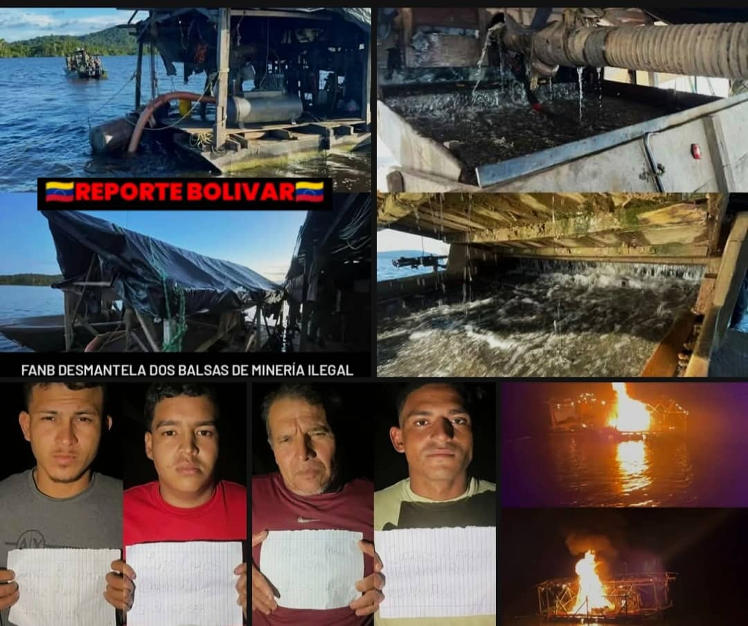 Efectivos de la Fuerza Armada Nacional Bolivariana (FANB), durante labores de patrullaje fluvial y reconocimiento en el Río Paragua, sector La Periquera, municipio Bolivariano de Angostura del estado Bolívar, lograron la localización y destrucción de dos  estructuras flotantes tipo balsa empleadas para la minería ilegal.