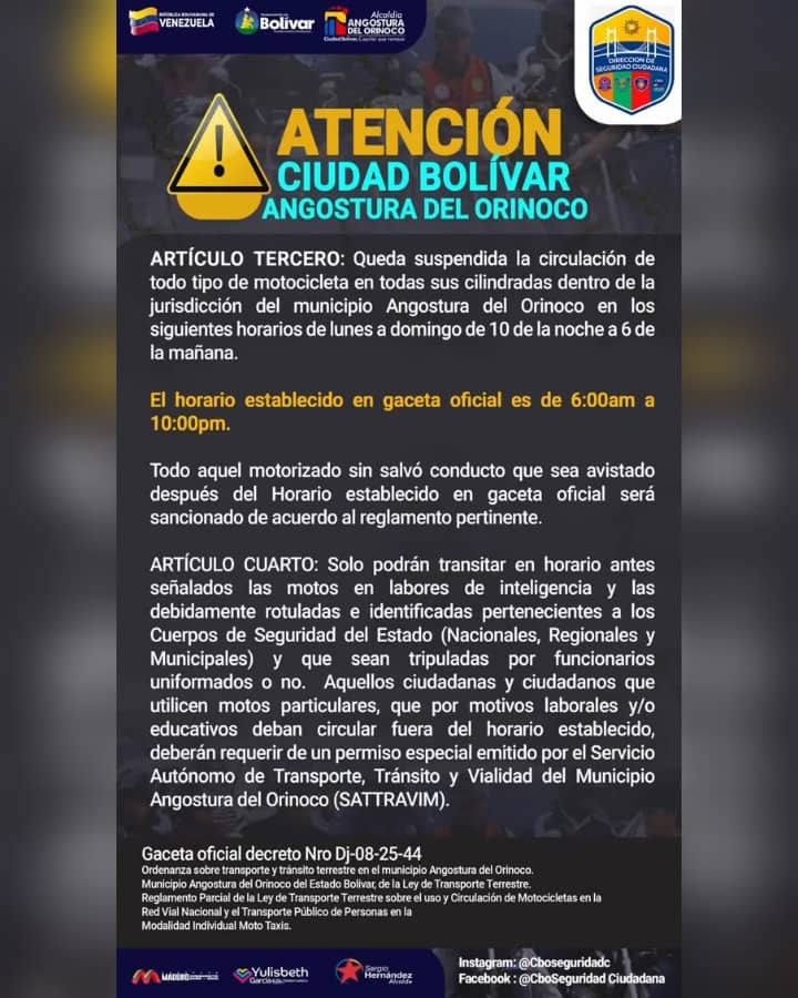 La Alcaldía de Angostura del Orinoco, a través de la Dirección Ciudadana informó este viernes que la circulación de motos queda suspendida de lunes a domingo desde las 10 de la noche hasta las 6 de la mañana.