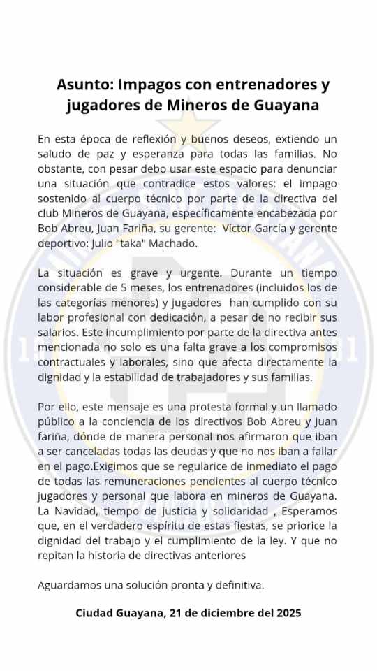 Vía redes sociales se conoció un comunicado en el que jugadores y personal técnico de Mineros de Guayana denuncian que tiene cinco meses sin cobrar su sueldo.