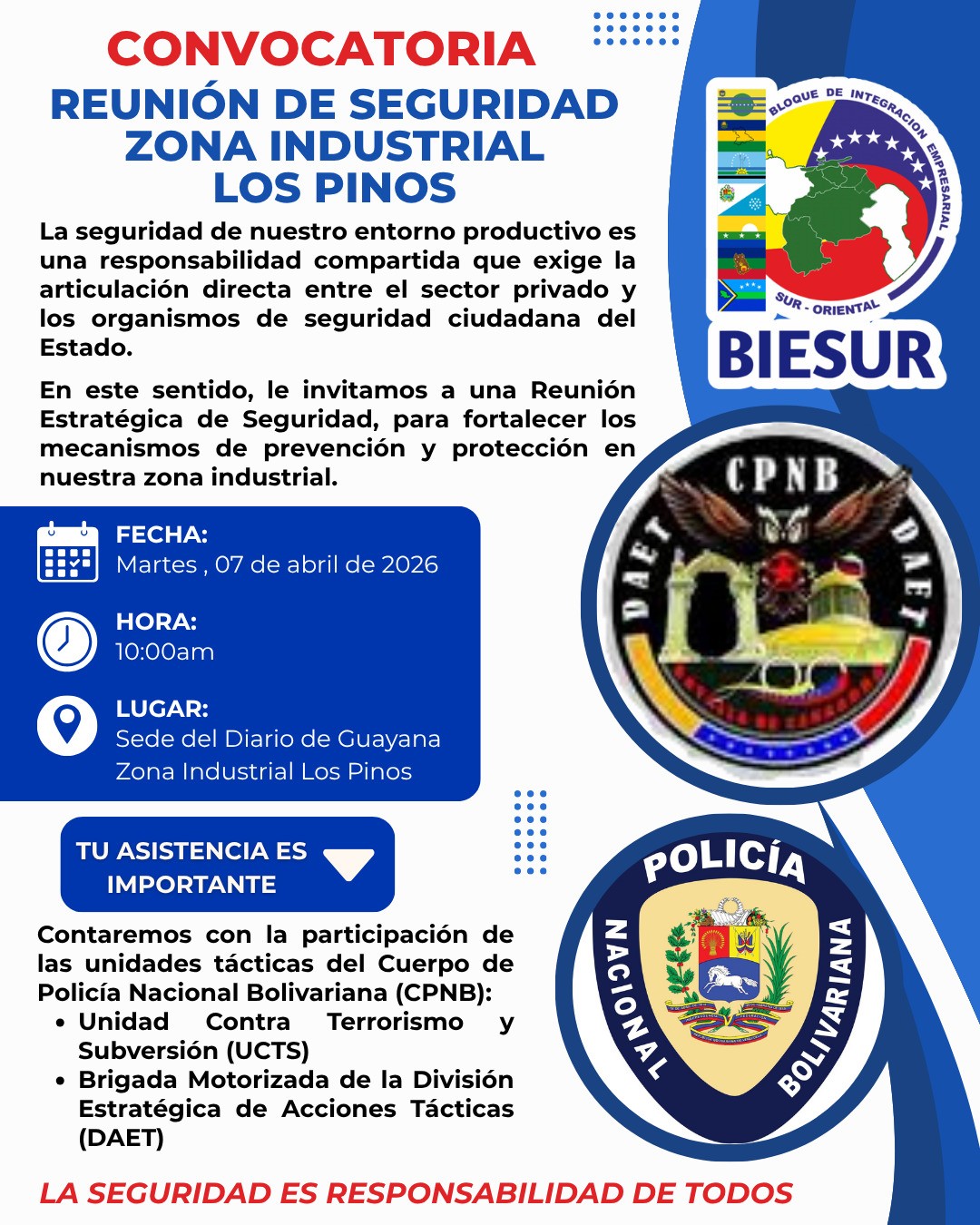 El Bloque de Integración Empresarial Sur-Oriental (Biesur), bajo la premisa de que «la seguridad es responsabilidad de todos», hace un llamado formal a los propietarios y representantes de empresas ubicadas en la Zona Industrial Los Pinos, para participar en una Reunión Estratégica de Seguridad el próximo martes 07 de abril de 2026.